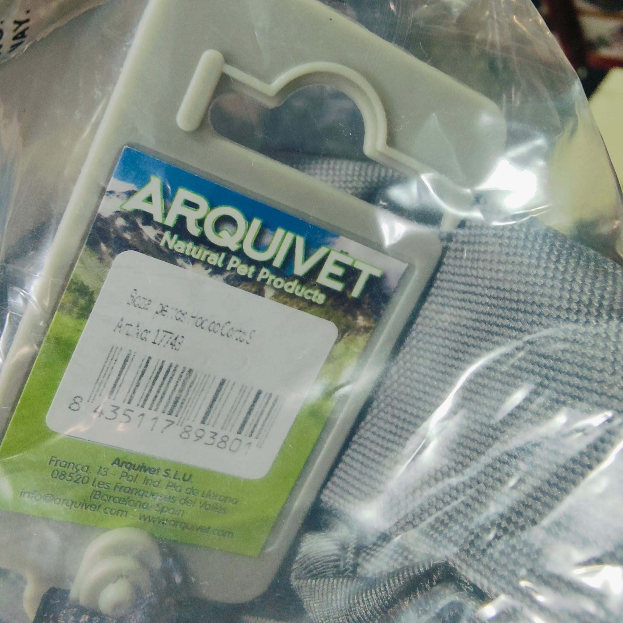 Bozal de color gris para perros de razas de hocico corto (Tipo: King Charles, Spaniel, Carlino).Les impide morder, pero les permite recibir premios o snacks.Fabricado en poliéster.Ajuste continuo de la correa frontal y de la del cuello mediante cierre con clip de plástico.