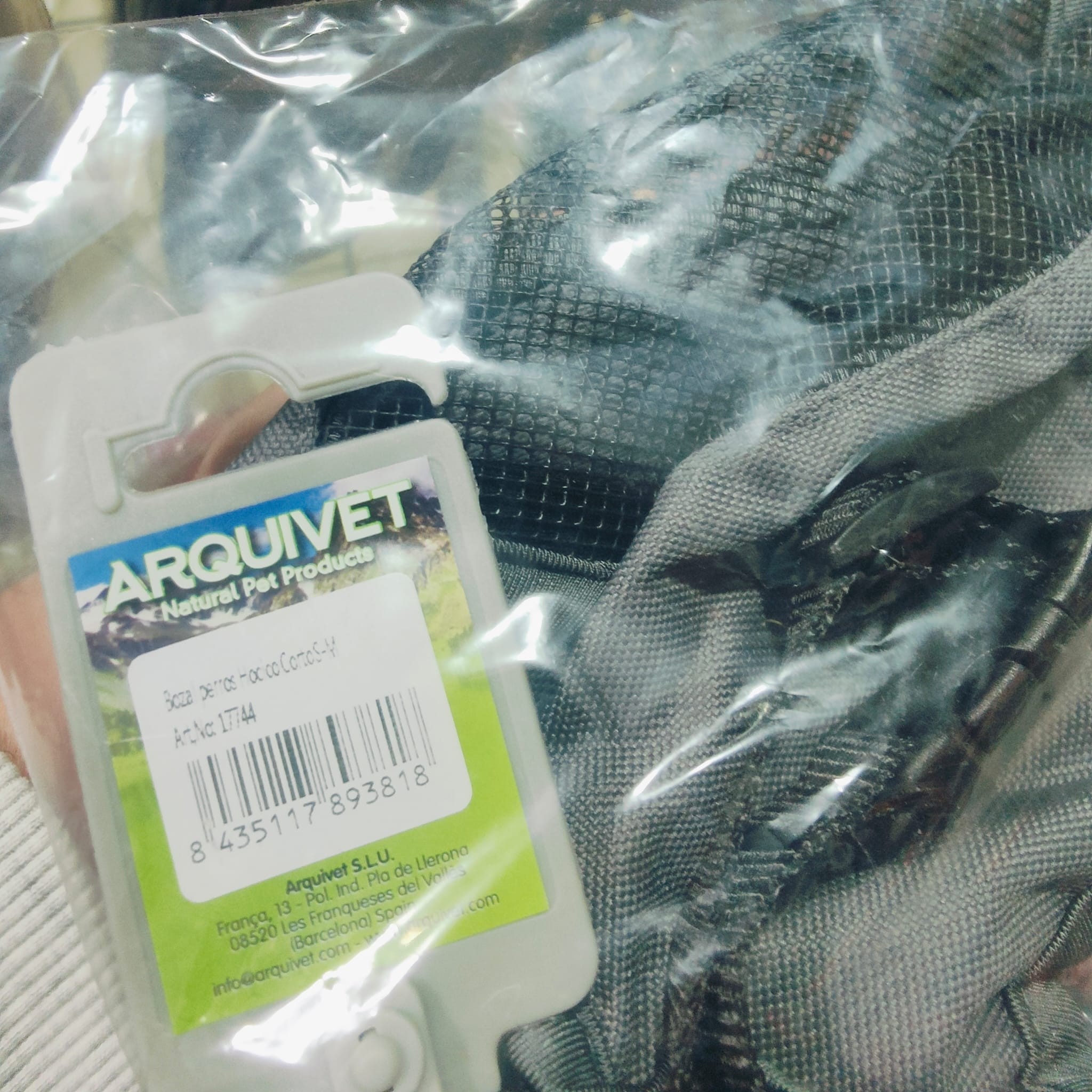 Bozal de color gris para perros de razas de hocico corto (Tipo: King Charles, Spaniel, Carlino).Les impide morder, pero les permite recibir premios o snacks.Fabricado en poliéster.Ajuste continuo de la correa frontal y de la del cuello mediante cierre con clip de plástico.