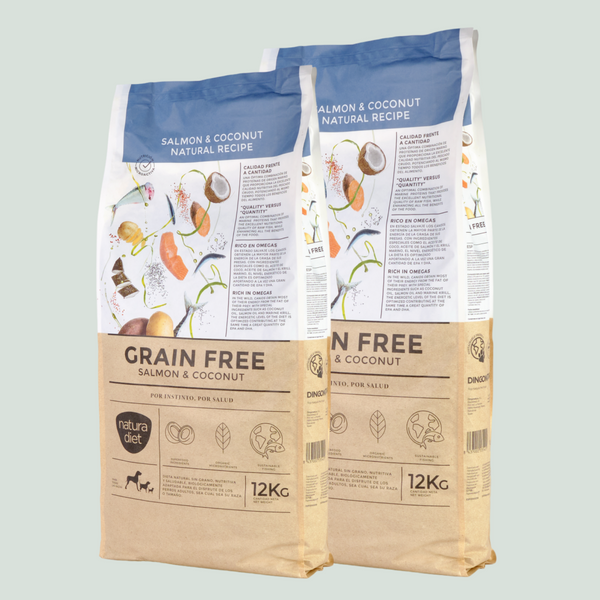 Natura Diet Grain Free Salmon & Coconut es un alimento completo, natural y nutritivo, elaborado a base de salmón, patata, aceite de coco, frutas y verduras, cocinado a fuego lento.