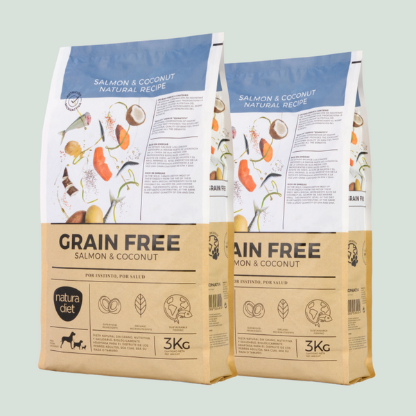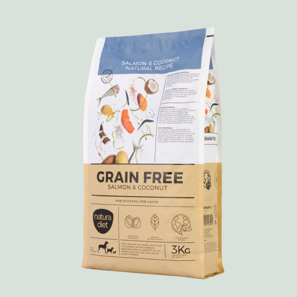 Natura Diet Grain Free Salmon & Coconut es un alimento completo, natural y nutritivo, elaborado a base de salmón, patata, aceite de coco, frutas y verduras, cocinado a fuego lento.